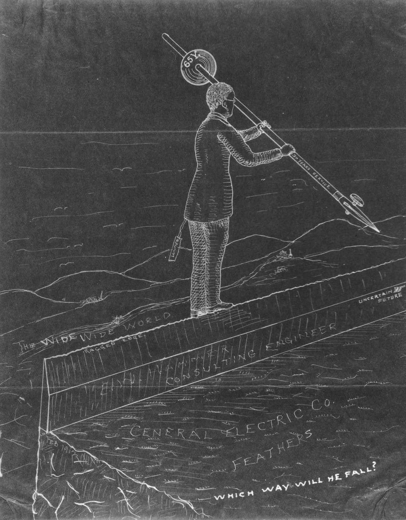 In 1884, Latimer began working with the engineering department of the Edison Electric Light Company in New York. Six years later, he was transferred to Edison’s legal department, where he served as chief draftsman for patents under legal dispute. His skill in illustrating electrical patents led 1896 to his appointment as draftsman for the Board of Patent Control, a body established by General Electric and Westinghouse to oversee patent disputes between them. Latimer worked with that group until 1911, when he left to practice as a patent consultant in New York. In an evocative self-portrait, Lewis depicted the difficulty, at his age, of deciding between job security with corporate enterprise, or the economic risks of independent consulting.