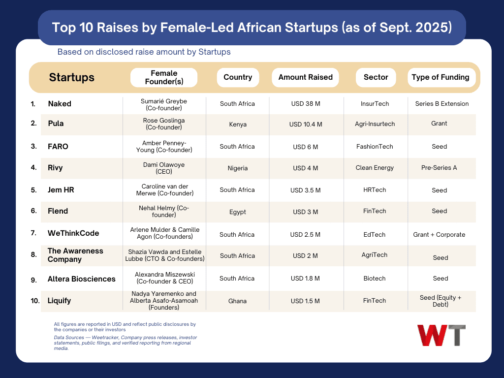 It is worth noting that within this list of 10 standout raises, only two are fully female-led ventures. The majority involve women as co-founders or CEOs within mixed leadership teams, a fact that underscores just how rare female-only leadership remains in the African funding landscape.